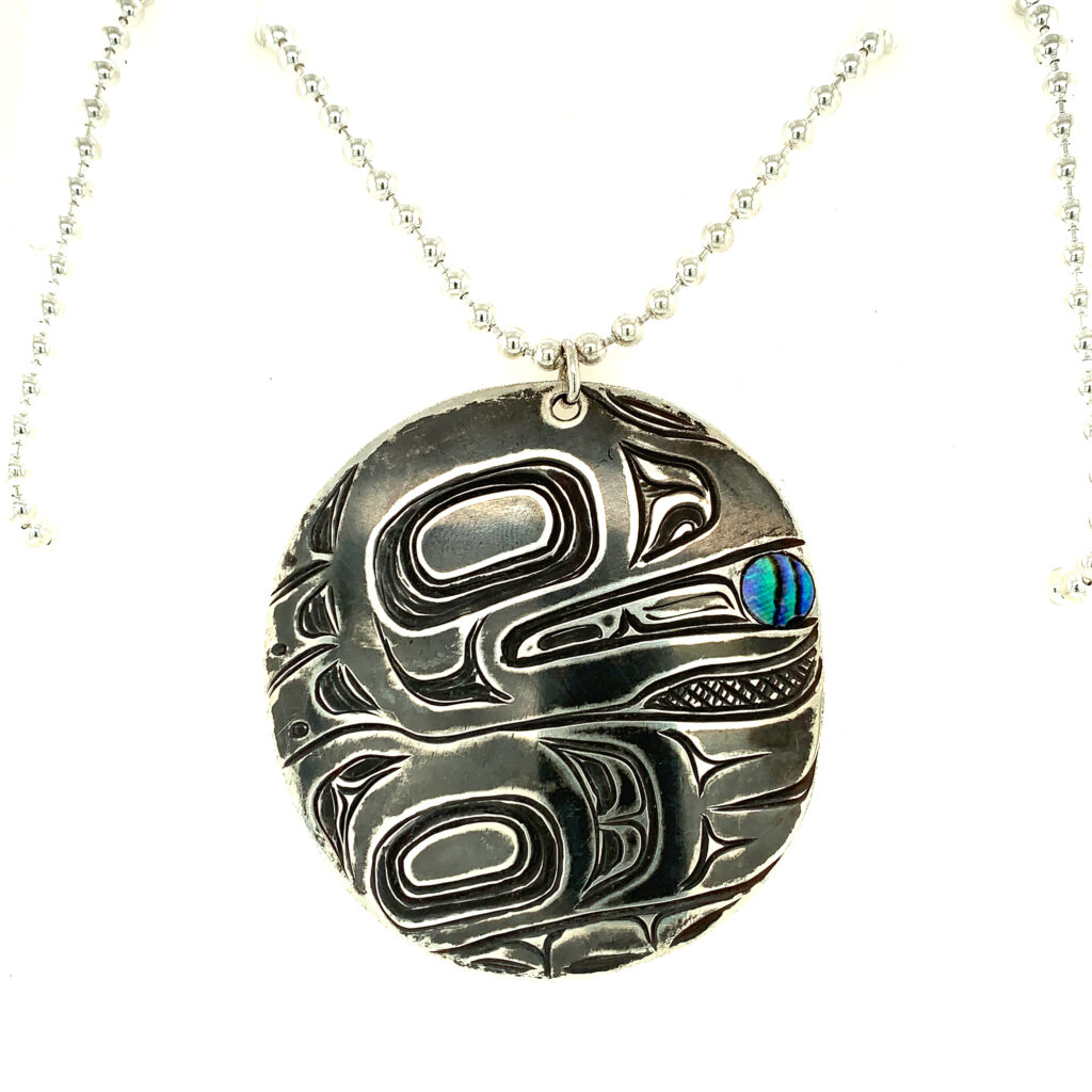 Sam Sheakley is a master silversmith and Tlingit artist based in Alaska whose work bridges traditional Indigenous formline art with contemporary wearable sculpture. Sheakley’s metalwork features hand-chased lines, carved formline motifs, and occasional inlays, giving each piece a sense of flowing movement and ancestral storytelling.